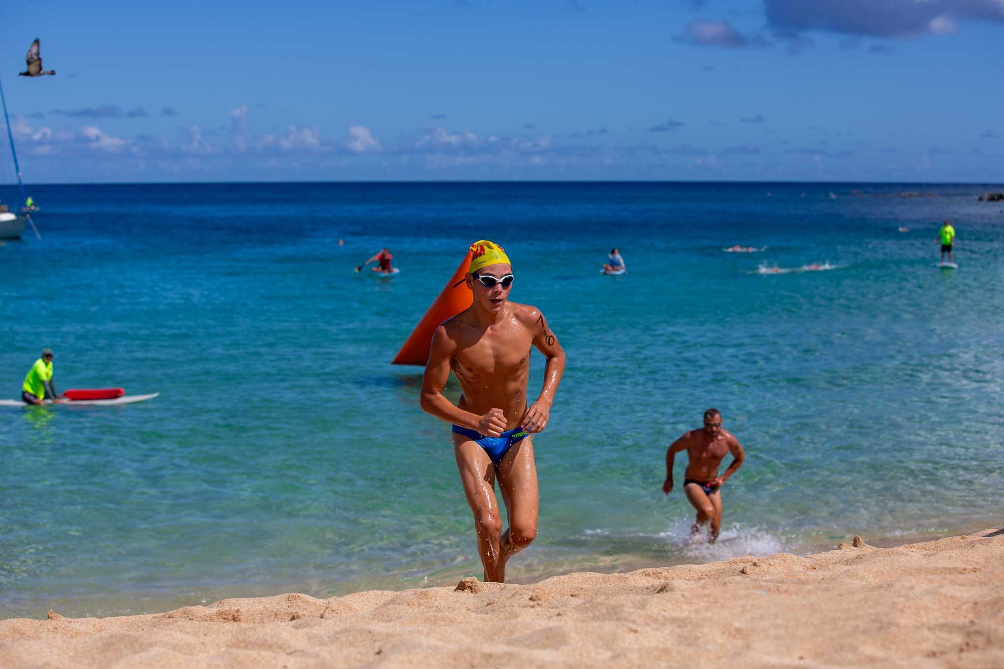 At the start of the race I stayed on the inside, close to shore, but it soon started to get really shallow, so I headed further out. About 15 minutes into the race, myself and two other swimmers had made a gap between us and the rest of the pack. After passing Shark’s Cove the waves started to get a bit bigger and choppier and a little harder to swim through, but as we rounded the rocks and into the bay of Waimea the water calmed and I started to pick up the pace and sprint into shore. I was able to get out of the water first and sprint up the sand for the win, with second and third places right behind me.