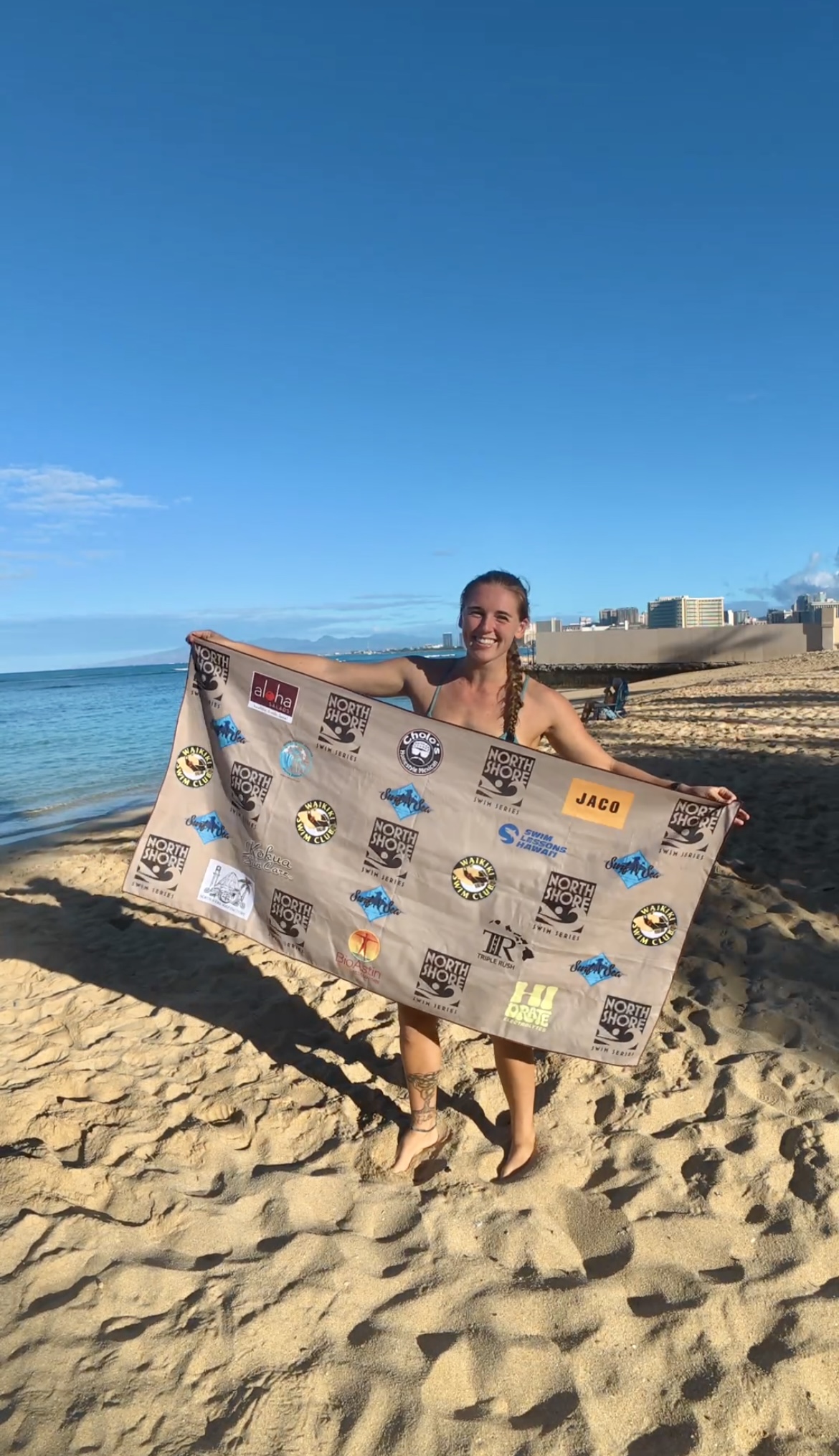 Lightweight, quick-drying 30″ x 60″ microfiber towel featuring unique artwork from each race of the 2025 North Shore Swim Series. Perfect for beach days or race memories—limited quantities available.